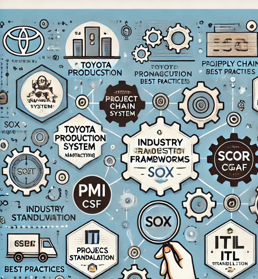 There are many popular frameworks referenced in the industry today. Toyota Production System or TPS is one of the most commonly used in the manufacturing industry. SOX is a framework for financial governance that was proposed post Enron debacle. PMI provides a highly popular framework for Project Management including agile . SCOR by APICS is popular among Supply Chain Professionals. ISO has established standards for Quality Management Systems, Business Continuity and Risk Management. COBIT, CSF, TOGAF, ITIL & many other technology frameworks are used by the IT industry.