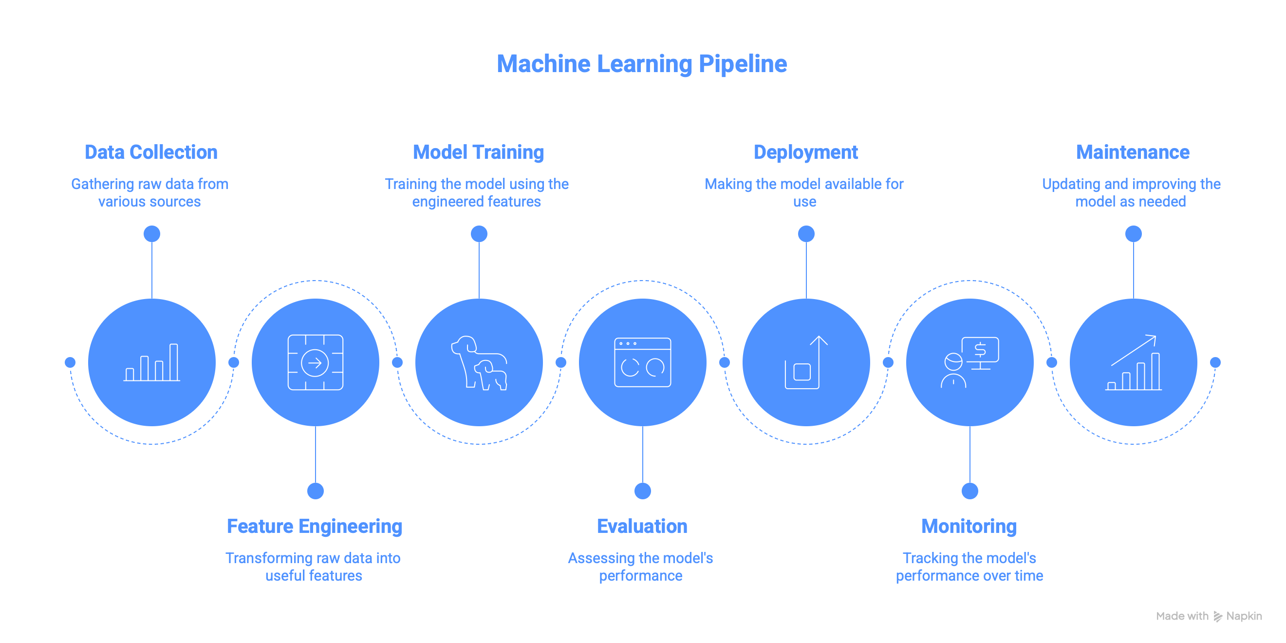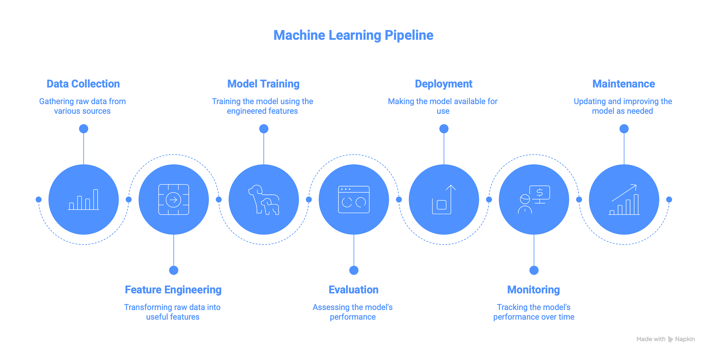 A machine learning pipeline transforms raw inputs into reliable, production-ready models through distinct and clear stages. Each phase adds structure and checks, from gathering data to keeping a live model healthy. This guide walks you through Data Collection, Feature Engineering, Model Training, Evaluation, Deployment, Monitoring, and Maintenance in straightforward terms.